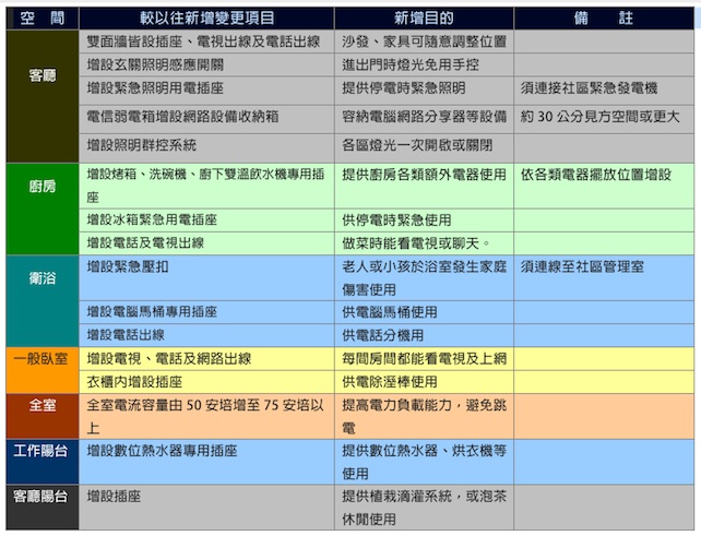 以下表格為現代化住家在用電設計上較以往新增之部分:< 居家用電變更設計一覽 >